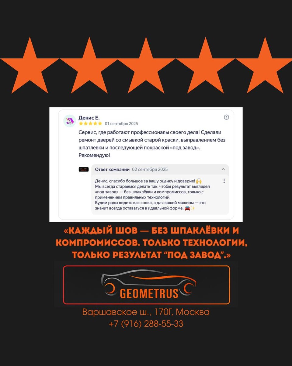 Кто-то выбирает быстрые решения: замазать шпаклёвкой, перекрасить сверху и выдать за готовое. Мы так не работаем. В Геометрусе каждое движение мастера — это точность, технологии и уважение к автомобилю. Посмотрите на отзыв Дениса. Ремонт дверей со смывкой старой краски, выправление металла без шпаклёвки и финальная покраска «под завод». Всё сделано так, будто машина только что сошла с конвейера. Почему? Потому что мы верим: идеальная работа не терпит компромиссов. Наши клиенты видят и чувствуют это. Их эмоции, когда они забирают автомобиль — бесценны. Радость, улыбка, тёплое «спасибо» и главное — доверие, которое возвращает их снова. Именно поэтому к нам приезжают не только на Kia или Nissan. В боксе стоят Porsche, BMW, Ferrari, Lamborghini. Потому что уровень один — заводской. Геометрус — сервис, который не делает «как-то». Мы делаем правильно. Всегда. 🚘✨ Варшавское шоссе, 170Г, бокс 38 Звони 📱 +7 916 288-55-33 https://wa.me/79162885533