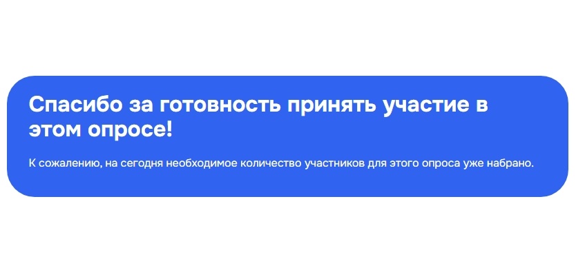 Я начала бодро и решительно, с намерением не пропускать ни одного предлагаемого опроса. А опросы... опросы почему-то перестали приходить. Потом, ближе к осени только начали появляться. Но, в большинстве своем когда я их открывала, то видела такую плашку: "К сожалению, на сегодня необходимое количество участников уже набрано".
