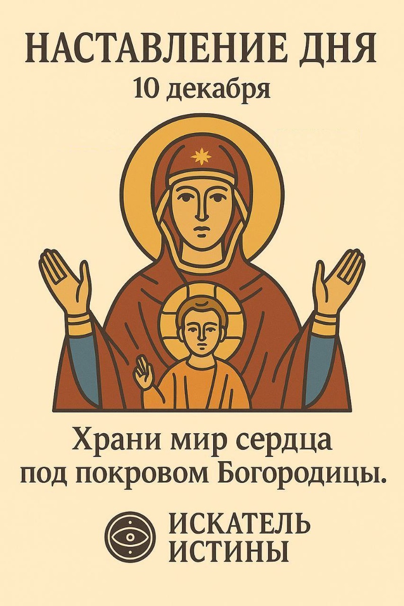 ☦️ Наставление дня — 10 декабря Празднование иконы Божией Матери «Знамение» Икона Божией Матери «Знамение» — образ мира, заступничества и тихой, несокрушимой надежды. Через этот святой лик Господь напомнил людям, что Его благодать хранит тех, кто возлагает своё упование на Него и смиренно ищет Его помощи. Пусть и твой день будет наполнен верой, миром в сердце и доверением Божией Матери, которая покрывает нас Своим материнским покровом.