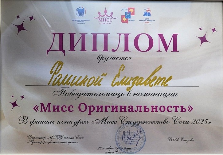 Рады сообщить, что на городском конкурсе «Мисс Студенчество — 2025, Сочи» студентка Международного инновационного университета Фомина