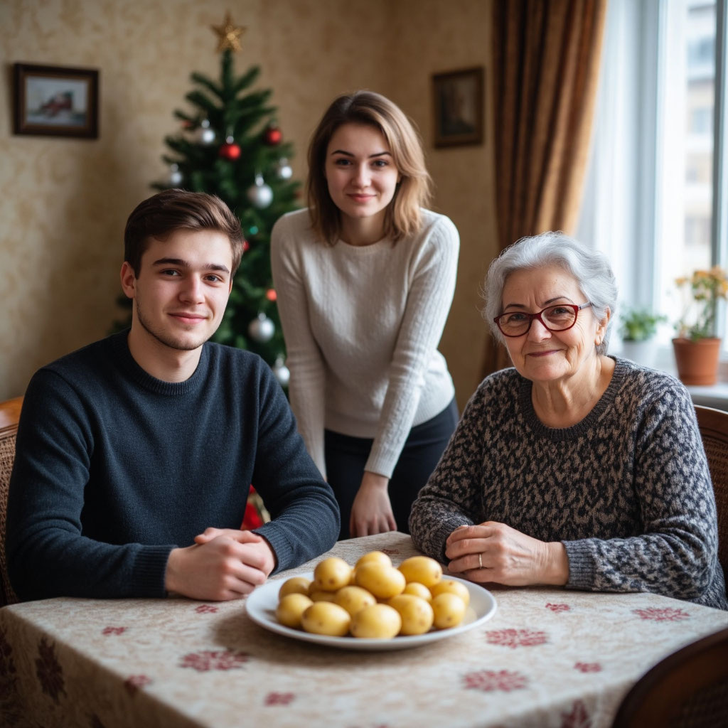 Через полчаса на столе красовалось то, что Елена Юрьевна, видимо, считала достаточным для встречи Нового года: большая миска оливье, щедро сдобренного майонезом, тарелка с разрезанной на сегменты варёной картошкой, посыпанной укропом, скромное блюдо с тощей, сероватой сельдью под луковыми кольцами. И салат «Мимоза» в хрустальной вазочке, доставшейся, вероятно, ещё в прошлом веке.