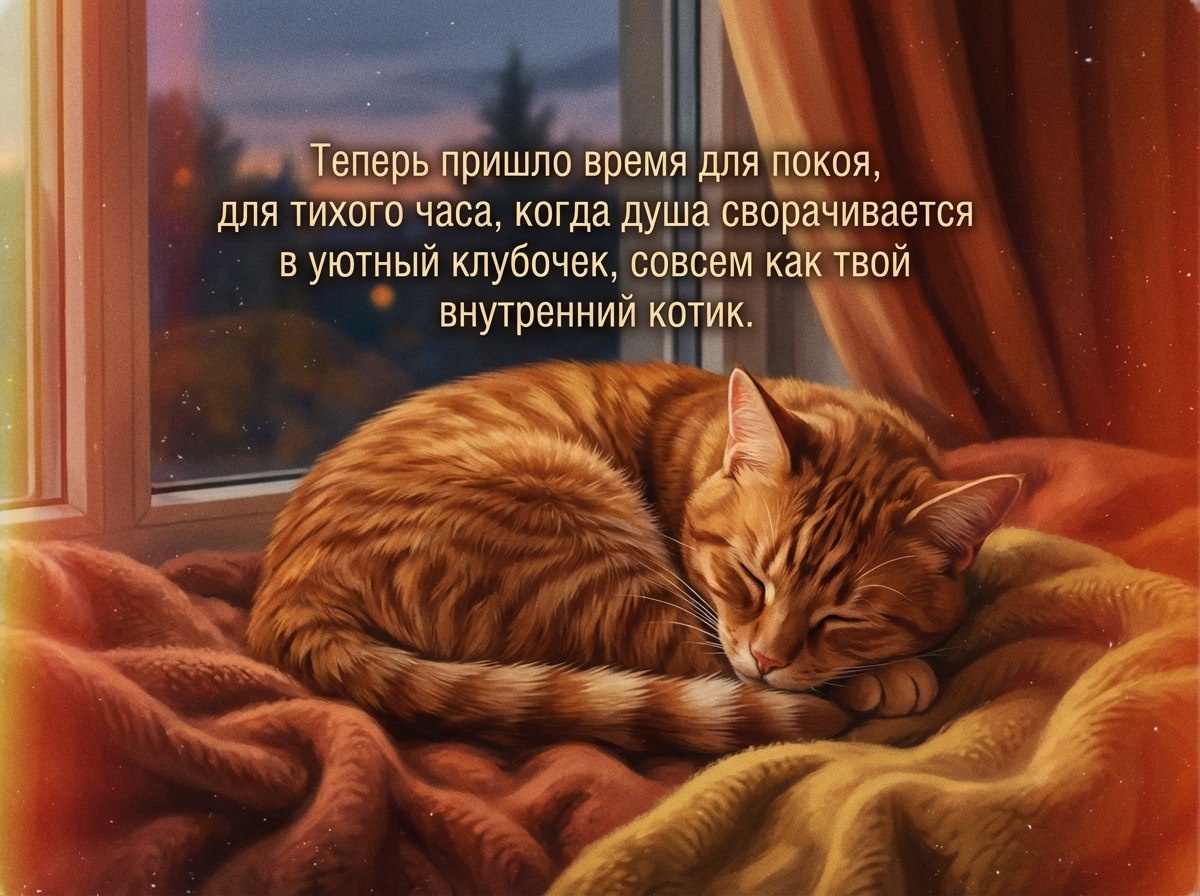 Смотри, как за окном сгущаются вечерние сумерки, укрывая мир бархатным одеялом. Позволь этому дню плавно раствориться, как след лапки на песке, который смывает тихая волна. Ты славно потрудился, мой дорогой человек, находил солнечные пятна в тени и мурлыкал своим делам, даже когда уставал. Теперь пришло время для покоя, для тихого часа, когда душа сворачивается в уютный клубочек, совсем как твой внутренний котик. Пусть все тревоги сегодняшнего дня останутся за порогом твоего сознания, словно мышки, которых не удалось поймать – они больше не важны. Вдыхай аромат ночи, выдыхай остатки суеты и готовься видеть самые мягкие и волшебные сны. Завтра будет новый день, а сейчас – время для тепла и безмятежности.