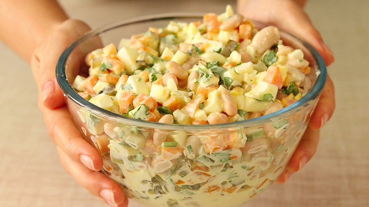Яйца, огурцы и морковь нарезать кубиком. Огурцы лучше использовать солёные (бочковые), а не кисло-сладкие. С фасоли слить сок и выложить её в салатник. Нарезать петрушку, выдавить чеснок, посолить и поперчить по вкусу. Заправить майонезом или сметаной.