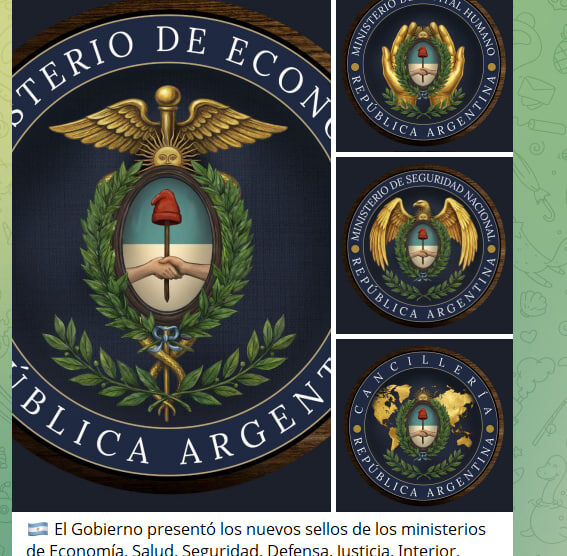 Правительство представило новые эмблемы: Economía, Salud 🏥 , Seguridad - безопасность👮♀️ , Defensa 🪖 , Justicia, Interior, Capital Humano, Desregulación, la Vocería, la Cancillería (МИД) y la Jefatura de Gabinete (аппарат каб. мина). Новые эмблемы министерств