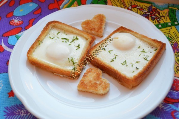 Завтрак на двоих От автора: Завтрак на двоих состоит из обычных ингредиентов, которые есть в вашем холодильнике. Цель данного кулинарного блюда удивить Вашего возлюбленного и проявить к нему внимание. Ингредиенты: Яйцо - 2 шт. Хлеб - 100 гр. (2 целых кусочка) Соль - 2 гр. Масло растительное - 25 мл. Источник: https://rusdinner.ru/page/zavtrak-na-dvoih