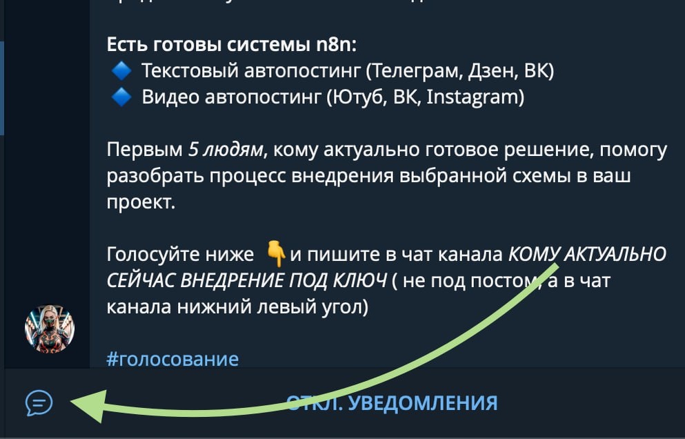 📱 Пишите в чат — это АНОНИМНО 😎 Вижу, что проголосовавших за «готовое решение» много, но в личку дошли не все. Возможно, стесняетесь спросить публично. Пишите смело сюда в чат канала (на сриншоте видно) — это конфиденциально, другие подписчики переписку не увидят. Коротко по цифрам: ⚡️ Внедрение: от 2 дней. ⏳ Экономия вашего времени: от 2 часов в день (60 часов в месяц). Считаем юнит экономику и если работа ваша вилка 1000₽ - 5000₽/час – это экономия 60к₽ - 300к₽/мес регулярно. За спрос денег не беру — пишите, обсудим. #автоматизация #нейросети #n8n #подключ
