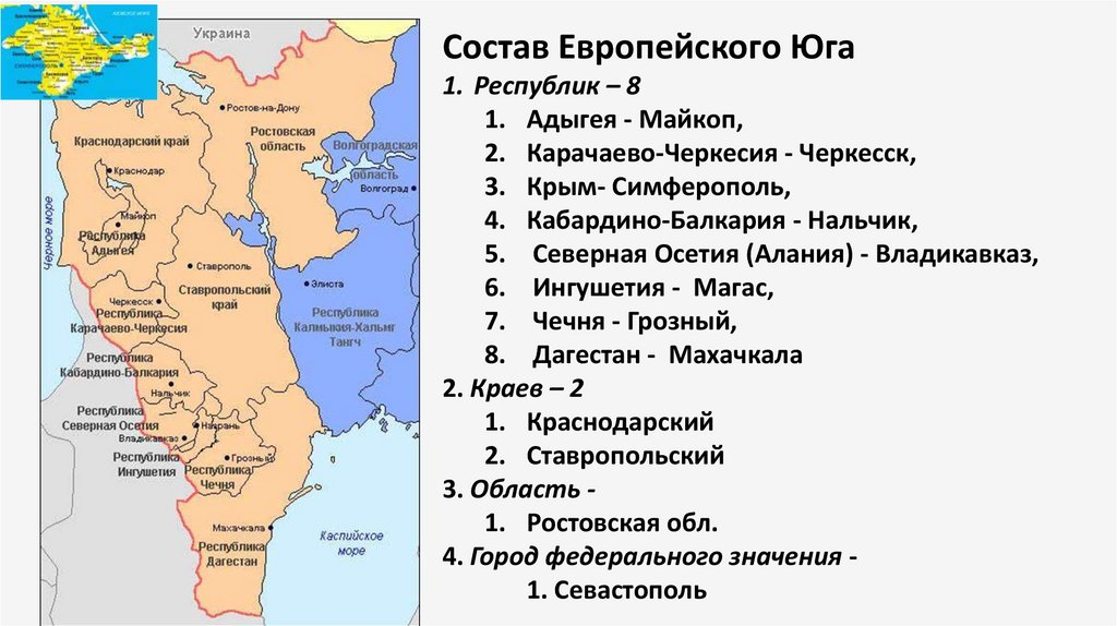 Географическое положение Европейского Юга Экономический район Европейского Юга включает 16 субъектов Российской Федерации: десять республик (Адыгея, Чеченская Республика, Карачаево-Черкесская Республика, Кабардино-Балкарская Республика, Северная Осетия — Алания, Ингушетия, Дагестан, Крым, ДНР, ЛНР), два края (Краснодарский и Ставропольский), три область (Ростовская, Херсонская, Запорожская) и город федерального значения — Севастополь. На сравнительно небольшой площади проживает около 28 млн человек. Особенности географического положения: приморское положение — выход к Каспийскому морю на востоке, к Чёрному и Азовскому морям на юге; пограничное положение с Украиной, Южной Осетией, Азербайджаном, Абхазией и Грузией. Главный Кавказский хребет — природная граница со странами Кавказа; соседское положение с центральными областями России. Природные условия и природные ресурсы района Природный рельеф чрезвычайно разнообразен, включает Русскую и Предкавказскую равнины, постепенно переходящие