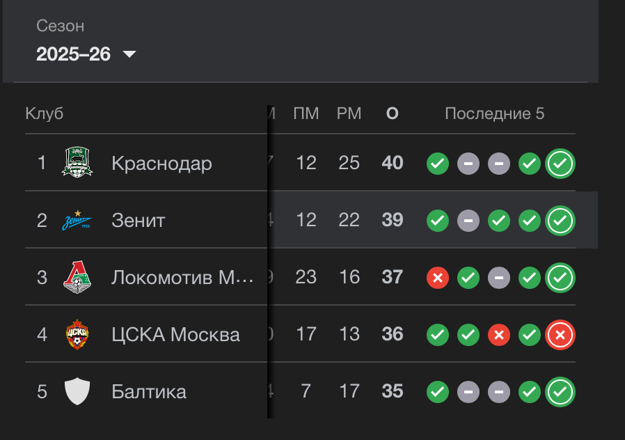 Свой блог начну с Российской-Премьер лиги. Команды отыграли свои последние официальные матчи в календарном году и можно подвести итоги: турнирная таблица выглядит следующим образом: 🥇на первом месте расположились «быки» из Краснодара, имея в своем активе 40 очков и являясь единоличным лидером чемпионата. «Краснодар» провел неплохой неплохой отрезок перед зимней паузой победив в трех из пяти последних матчах лиги, «распилили» очки лишь с «Балтикой» (1:1) и «Локомотивом» (1:1). 🥈с разницей в одно очко уступив лидеру чемпионата перед зимней паузой остановился «Питерский» Зенит. У них статистика в крайних матчах поинтереснее (4 победы, 1 ничья в 5 матчах), но всё же где-то не досчитались очков, чтобы хотя бы сравняться с «Краснодаром». 🥉на третьей строчке расположились «железнодорожники» из Москвы, имея в своем активе 37 очков. «Локомотив» в последних пяти матчах имеет поражение в отличие от своих «визави», которые расположились выше в турнирной таблице. Команда Михаила Михайловича