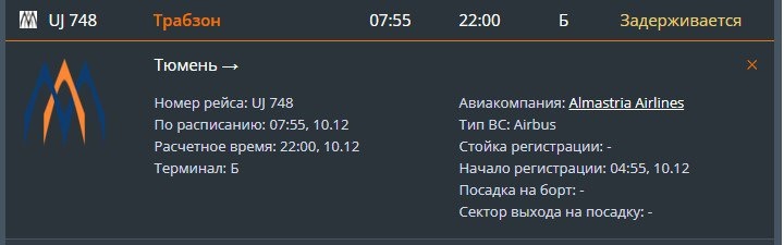 Самолет авиакомпании AlMasria из Тюмени в Египет задержится более чем на 12 часов. По данным от представителя авиакомпании, замерз клапан топливного бака. Рейс UJ-748 должен был вылететь в Шарм-эль-Шейх в 07:55, сейчас на онлайн-табло аэропорта Рощино указано расчетное время 22:00. Причем пункт назначения – Трабзон. Как нам пояснили в AlMasria, в Турции не исключена промежуточная посадка для дозаправки, но, возможно, она и не потребуется. С чем связана вероятная корректировка маршрута, читайте на ТурДоме. По словам представителя перевозчика, всем пассажирам предоставлены напитки, питание, гостиница в соответствии с Федеральными авиационными правилами. @tourdom