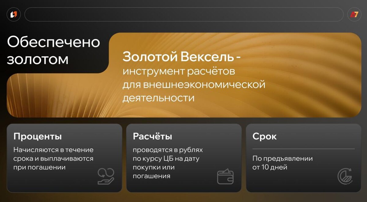 «Золотой» инструмент для ВЭД - у бизнеса появилась альтернатива SWIFT? Как бы нам не рассказывали, что санкции идут только на пользу, бизнес и экономика от них страдают. Например, из-за ограничений SWIFT и рисков при его использовании компаниям приходится искать альтернативы для международных расчетов. Минфин и ЦБ даже договорились о легализации расчетов за операции ВЭД в криптовалюте. Но уже есть решения, в которых можно обойтись без крипты. Например, «Золотой вексель» от платформы А7. Золотой вексель А7 - это ключевой инструмент казначейства для бизнеса в условиях санкций. Он решает три задачи разом: - Дает доходность 10% годовых в валюте (как депозит). - Страхует от колебаний курса (как форвард). - Является работающим платежным средством для расчетов с контрагентами в 150+ странах. Получается, у бизнеса теперь есть управляемый валютный риск, доходность на короткие деньги и работающий инструмент для расчетов при серьезных ограничениях других каналов. Как это работает: 1. Компан