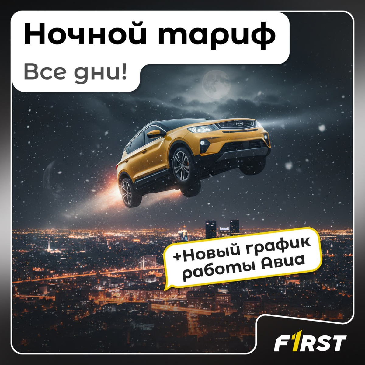 🌙 НОЧНОЙ ТАРИФ ВСЕ ДНИ + НОВЫЙ ГРАФИК АВИА 🙌 Запускаем ночной тариф во все дни работы площадки на Авиамоторной! Взять авто на Авиа по этому тарифу теперь можно: ПН-ЧТ с 18:00 до 19:00 ПТ с 18:00 до 20:45 Сдать авто: ВТ-ПТ с 7:00 до 9:30 СБ с 9:00 до 9:30 В Коптево действуют прежние условия ночного тарифа: https://t.me/taxi_f1rst/1954 👍 Если все условия соблюдены, то вы платите в 2 раза меньше за аренду. Стоимость: 🟩 Эконом от 1100 рублей 2300 рублей 🟩 Комфорт от 1500 рублей 3200 рублей 🟩 Комфорт+ от 1500 рублей 3500 рублей ✅ Чтобы воспользоваться ночным тарифом ➡️ОСТАВЬТЕ ЗАЯВКУ ☝️ Если вы не успеваете сдать автомобиль вовремя, то аренда спишется в стандартном режиме. В субботу сдать машину могут только водители, работающие по "ночному тарифу". 🕙 В связи с этим новый график работы на Авиа с завтрашнего дня: ПН-ЧТ с 7:00 до 19:00 ПТ с 7:00 до 21:00 СБ с 9:00 до 15:00 💬 Ночники на связи? Как вам? — 👍/👎 FIRST🏆: 🚕 Арендовать авто 🤖 ТГ бот, коины 📞+74994042815 - к