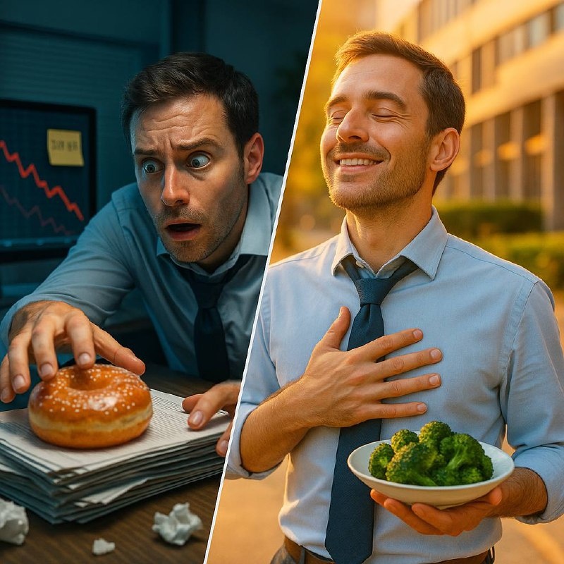 ▎🧠🍔 ПОЧЕМУ ПОСЛЕ СТРЕССА РУКИ САМИ ТЯНУТСЯ К ХОЛОДИЛЬНИКУ? Знакомая ситуация? Тяжёлый день на работе, начальник довёл, дедлайны горят... И вот вы уже стоите у холодильника в обнимку с тортом. А брокколи грустно лежит в углу, никому не нужная. Давайте разберёмся, почему так происходит, и что с этим делать (спойлер: без магии и «просто возьми себя в руки»). ▎🔬 ЧТО ТАКОЕ ОСЬ «КИШЕЧНИК–МОЗГ»? Представьте себе двустороннюю супермагистраль между вашим мозгом и кишечником. По ней постоянно ездят «курьеры» — гормоны и нейромедиаторы, которые передают сообщения в обе стороны. Как это работает: - Мозг в стрессе → шлёт сигнал кишечнику - Кишечник получает сигнал → меняет выработку гормонов - Гормоны влияют на настроение и аппетит ▎🍰 ПОЧЕМУ ИМЕННО БУЛКА, А НЕ БРОККОЛИ? ▎Виноваты не вы, а биохимия: 1. Кортизол (гормон стресса) повышается → Организм думает: "Опасность! Нужна быстрая энергия!" → Требует быстрые углеводы (булки, сладкое, чипсы) 2. Серотонин (гормон счастья) падает → 90% с