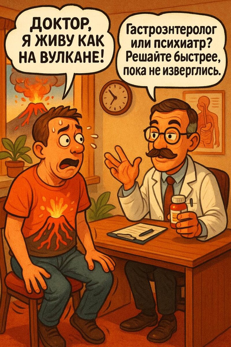 Друзья, пусть эти выходные пройдут без вулканических потрясений 🌋😊 Желаю внутреннего спокойствия, ровного пищеварения и ясной головы. Добавьте побольше прогулок, лёгкое меню и щепотку юмора — и ни гастроэнтеролог, ни психиатр не понадобятся. А если вдруг почувствуете, что начинает бурлить, не ждите извержения — выбирайте нужного специалиста сразу. Хорошего отдыха и свежего воздуха! Врач-гастроэнтеролог Альмасри Али Мохамад