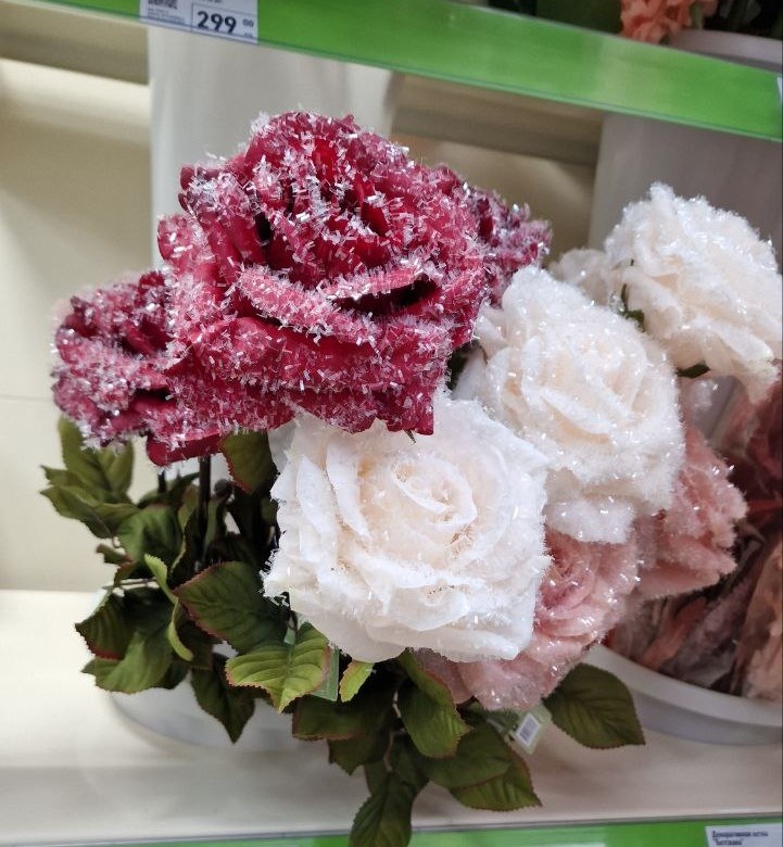 Новые роскошные декоративные розы появились, длина 75 см, эффект «засыпанные снегом», выглядят богато: блестят, переливаются, лепестки аккуратные, не бахрамятся. Цена 385 рублей. Три цвета на выбор.