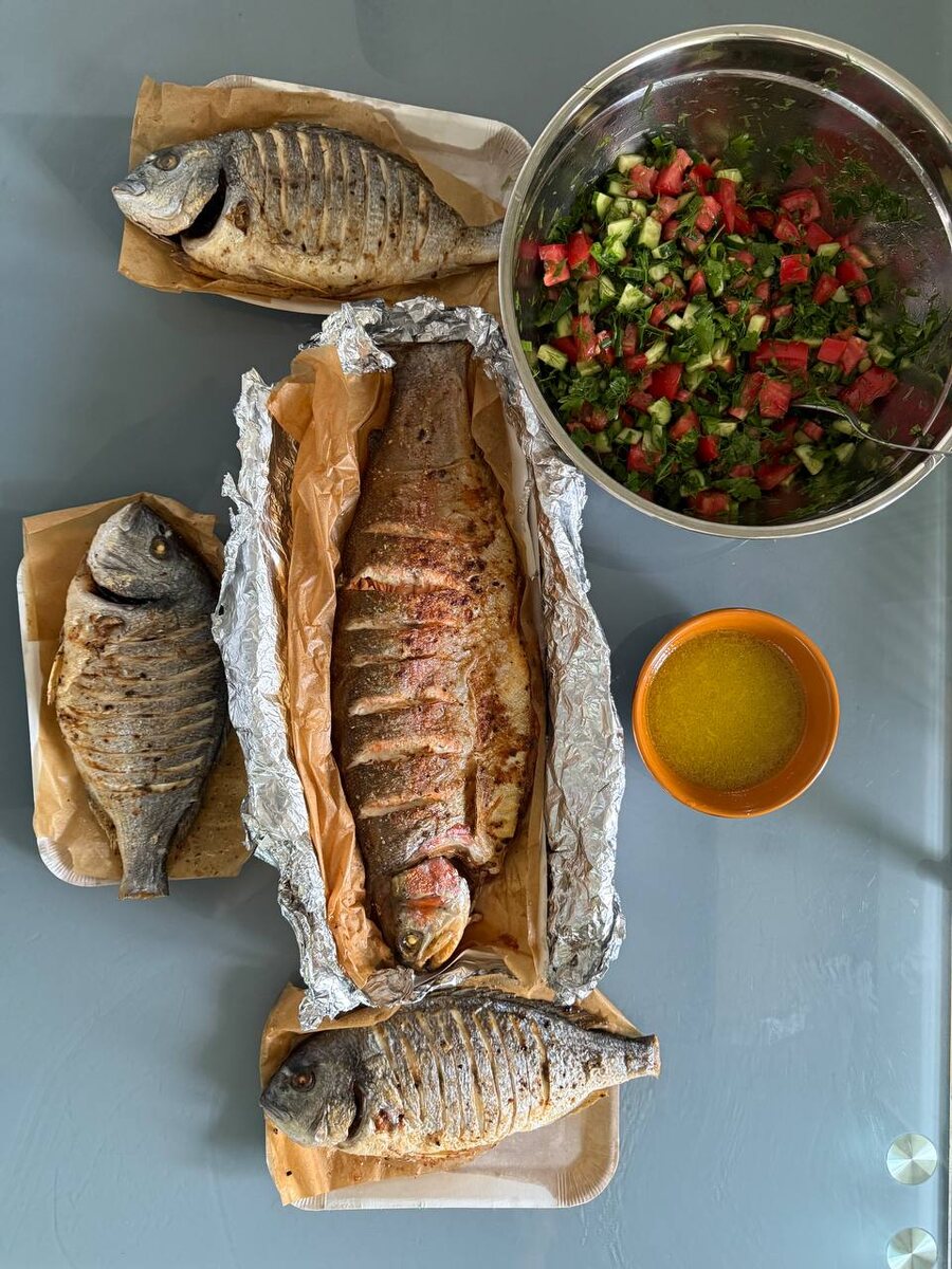 Всем привет, друзья! 👋 Сегодня делюсь тем, что оказалось у меня на тарелке в субботний полдень и почему эта тарелка для меня больше чем просто еда. Обед субботы: одна форель и три дорадо 🐟🐟🐟, а рядом большой овощной салат, щедро политый оливковым маслом. В отдельной соуснице дымится мой любимый сирийский соус, который готовят исключительно к рыбе: сок лимона и оливковое масло в пропорции 2 : 1, растёртый чеснок и щепотка соли. Простота, а вкус мгновенно переносит к тёплому Средиземному морю 🌞. Форель славится мягким вкусом и высоким содержанием омега-3, витаминов D и группы B, а ещё цинка и селена – крепкое сердце и сильный иммунитет. Дорадо (тот самый «морской карась») богата легкоусвояемым белком, фосфором и йодом, что помогает мозгу и щитовидке. Не случайно рыба – один из главных столпов средиземноморской кухни, которую врачи считают самой полезной диетой мира 🌍. С рыбой я на «ты» с детства. Отец всегда сам выбирал, чистил ; я унаследовал эту привычку, ведь мама не пере