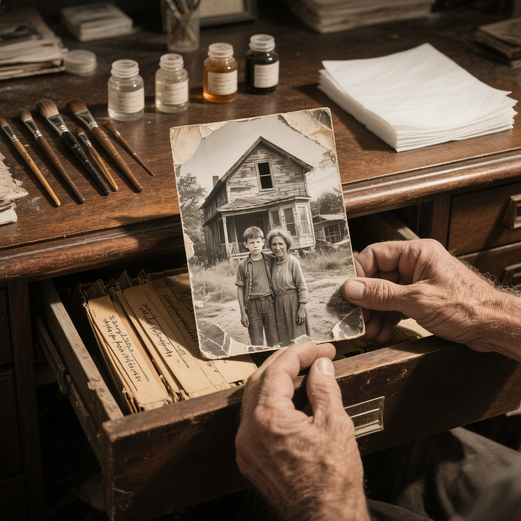 Рабочее место помощника было образцом педантичного порядка: кисточки, разложенные по размеру, баночки с растворами, стопка чистой промокательной бумаги. Ничего лишнего. Воронов проверял ящики один за другим. В нижнем, под папками с рецептурами лаков, он нашел неожиданное: не ключ, а небольшую, потёртую на углах фотографию. Старая, чёрно-белая. На ней — мальчик лет десяти и женщина с усталым, но добрым лицом на фоне большого, но запущенного деревянного дома. На обороте потускневшими чернилами было выведено: «Киря с мамой. Дача под Зеленогорском. 1998».