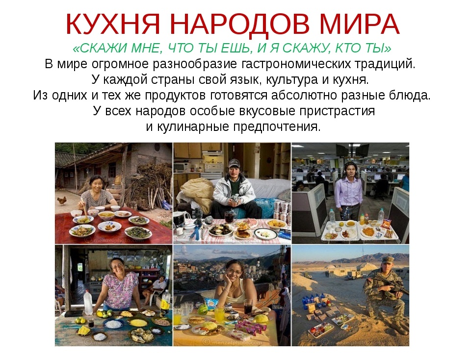 Национальная кухня – это совокупность кулинарных традиций и практик, распространенных в определенном регионе или которые соблюдаются некой этнической группой. Как правило, свое название национальная кухня получает от региона распространения или места возникновения. На формирование гастрономических предпочтений разных народов мира не в последнюю очередь влияет климат региона, а если точнее – то, какие продукты можно вырастить в естественных условиях. С другой стороны на национальные кулинарные практики серьезный отпечаток ставят религиозные каноны, которых придерживается народ. Зависимо от распространения, кулинарные традиции могут быть региональными (присущи отдельному региону, стране) либо глобальными (известны и практикуются если не во всем мире, то в большей его части). К списку последних причисляют японскую кухню с ее всемирно известными суши и рамэн, китайскую – с ее изобилием ароматных блюд из лапши, риса, овощей, приправленных разными соусами и специями, средиземноморскую, которая считается одной из самых древних и самых полезных на планете. В связи с повышением интереса к здоровому питанию стремительно растет популярность индийской кухни, богатой овощами, полезными маслами и ароматными травами. Французской кулинарной традиции отдают предпочтение ценители тонких вкусов и богатых ароматов. Любители риса, колбас, баклажанов и тушеной фасоли отдадут предпочтение испанской кухне, а гурманы, которые не могут устоять перед острой едой, конечно же отдадут предпочтение национальной мексиканской пище. И это только маленькая часть из огромного списка национальных кухонь мира, ведь сколько на нашей планете народов, столько и гастрономических традиций.