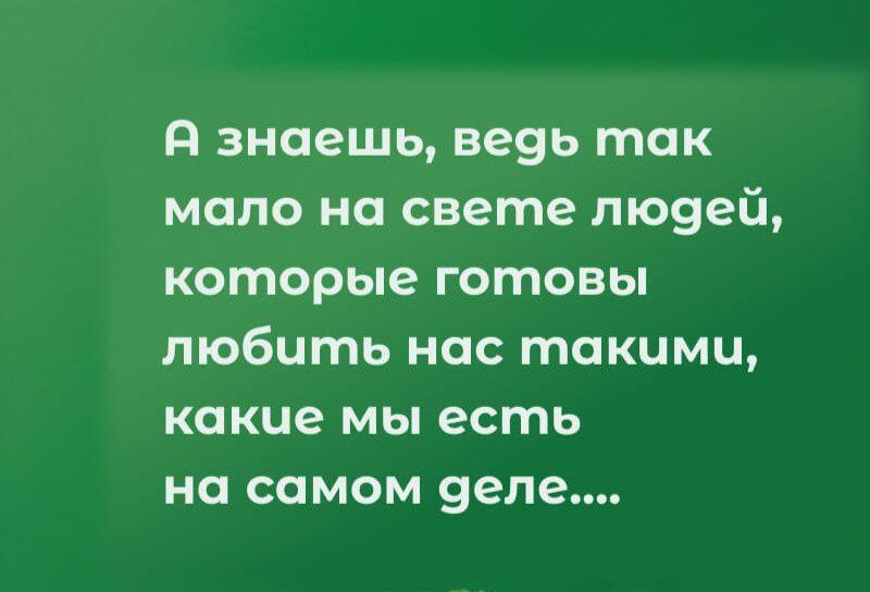 А знаешь, ведь так мало на свете людей, которые готовы любить нас такими, какие мы есть на самом деле. Любить не за какие-то достижения и заслуги. Не за красивое тело или толстый кошелек. А просто – Любить. Любить именно тебя, настоящую, неидеальную. Любить со всеми твоими сомнениями, недостатками и заморочками. Любить и принимать, не пытаясь при этом изменить и переделать… И если в вашей жизни есть такие люди, то, кем бы они ни были – дорожите ими!🙏