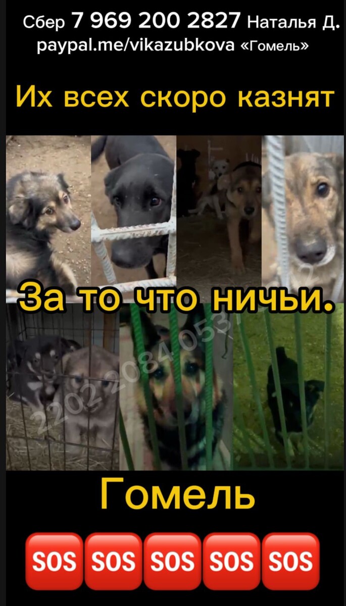 Друзья ситуация критическая🆘🆘🆘. Усыпалка Гомеля переполнена🐕🐕🦺🐶🐕🐕🦺🐶🐶. Все сроки прошли и хвостиков срочно надо вывозить!!! Иначе 💉💀🔥…. Ищем семьи и кураторов. Все собачки хорошие, добрые. Никому ничего плохого не делали. Виноваты только в том что ничьи. А это значит что по законам Беларуси их могут усыпить в любой день!!! Пожалуйста спасите невинную душу. Возьмите себе счастье в дом!!! А они взамен подарят Вам море любви и преданности!!! Если Вы не можете взять хвостика в дом помогите приобрести для них корм, вакцины, средства обработки🙏🏻🙏🏻🙏🏻🙏🏻. Спасибо Вам большое. Пусть у Вас все будет хорошо. Да не оскудеет рука дающего!!!! Пожалуйста 🆘🆘🆘. Спешите делать добро!!!РЕКВИЗИТЫ ДЛЯ ПОМОЩИ: ✅СБЕР: 2202 2084 0537 8242 ДУБИНСКАЯ НАТАЛЬЯ ЮРЬЕВНА. Карта привязана к телефону: 7 969 200 2827 ✅PAYPAL: https://www.paypal.me/vikazubkova с обязательной пометкой «Гомель». 🐾 Даже 30 рублей — вклад в его спасение.