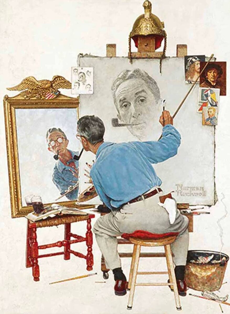 🕯На холсте — Роквелл, который сидит спиной к зрителю, смотрит в зеркало и пишет себя. На мольберте — образ, чуть более «героизированный», чем в реальности. На стене висят портреты Пикассо, Дюрера, Рембрандта — великие тени прошлого [Роквелл явно чувствует себя в диалоге с историей искусства. Но делает это с юмором: среди титанов он спокойно лепит самого себя, простого американского иллюстратора