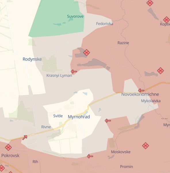 Украинский военный блогер Арти Грин, он же Евгений Бекренев, признал блокаду группировки ВСУ в Мирнограде. Ранее связанный с украинцами ресурс DeepState перекрасил последний выход из котла из цвета украинского контроля в «серую зону». Интересно, что это произошло через неделю после российских заявлений о полной блокировке украинских войск под Мирноградом.