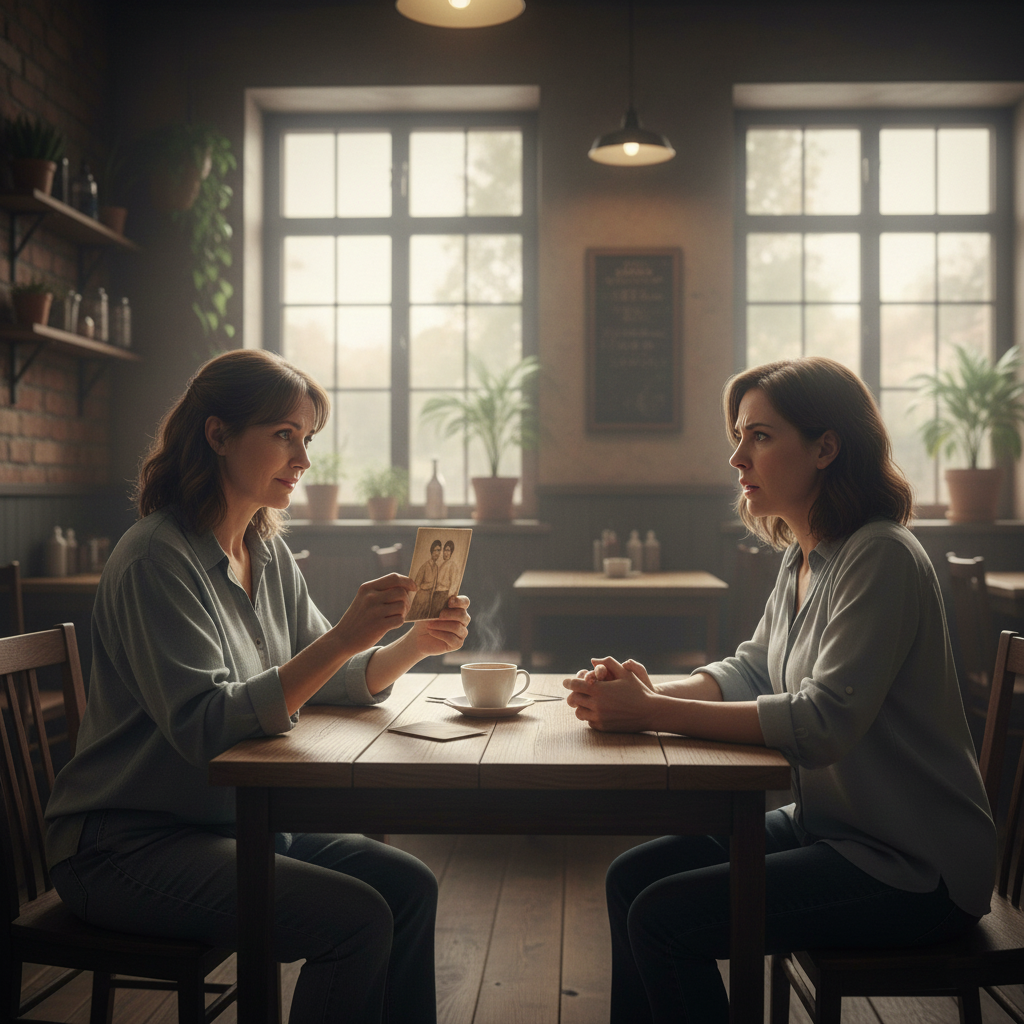 Кафе маленькое, уютное. За столиком — женщина лет пятидесяти. Лицо спокойное, но глаза… как будто после многолетнего дождя.