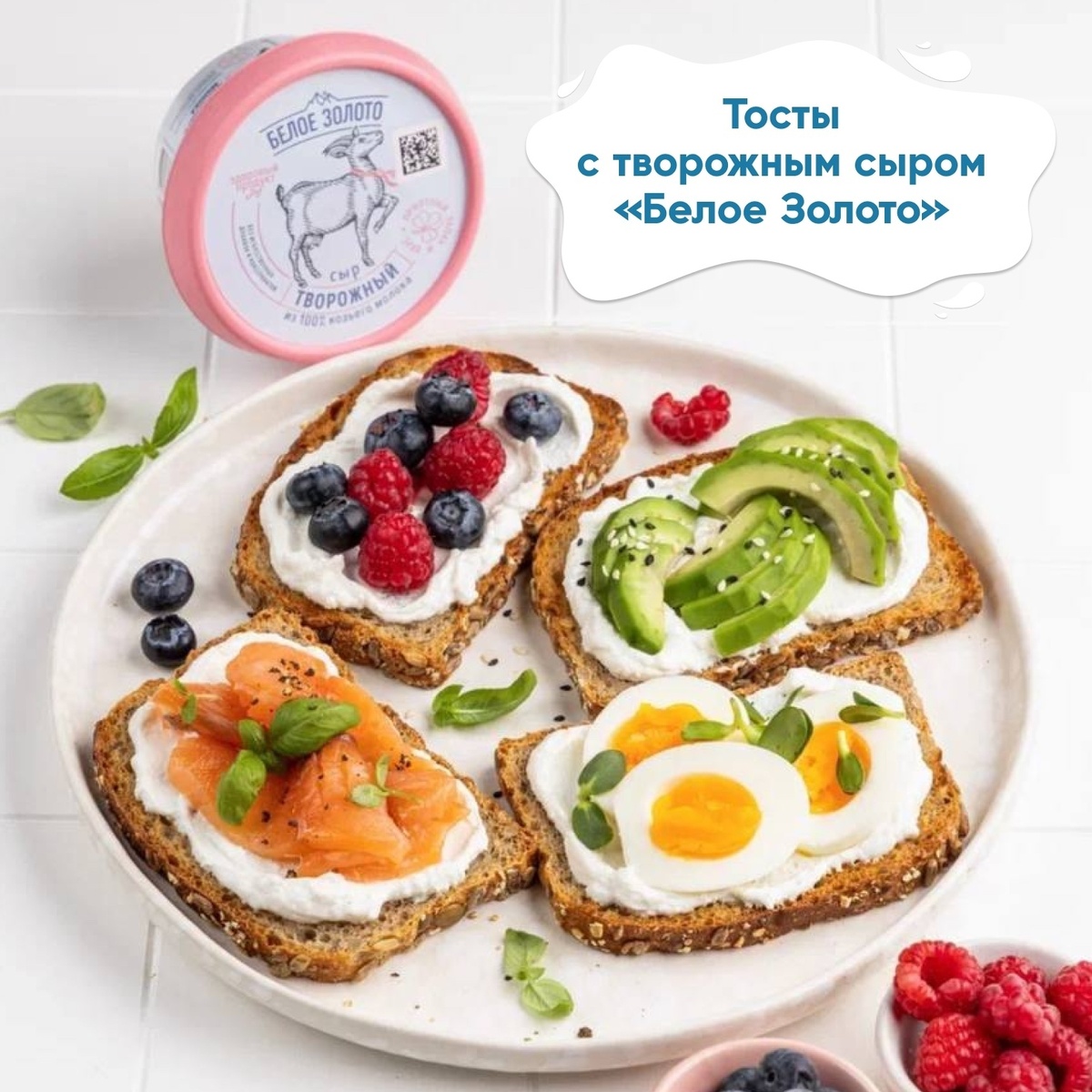 Попробуйте тосты с нежным творожным сыром «Белое Золото». Он изготовлен из 100% козьего молока, богат полезными микроэлементами и легко усваивается. Умеренная калорийность и высокое содержание белка делают его отличным ингредиентом для сбалансированного завтрака. 1. Тост с ягодами •цельнозерновой хлеб;