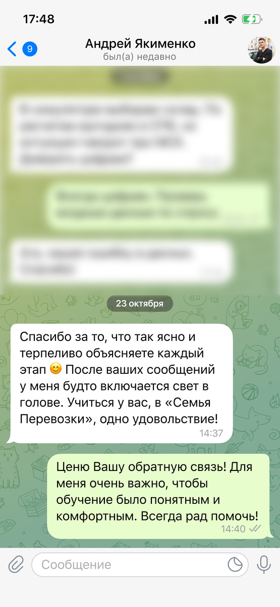 Каждый день нам пишут те, кто уже прошёл корпоративную подготовку, сделал свои первые шаги в логистике и начал зарабатывать вместе с АО «Семья Перевозки».
