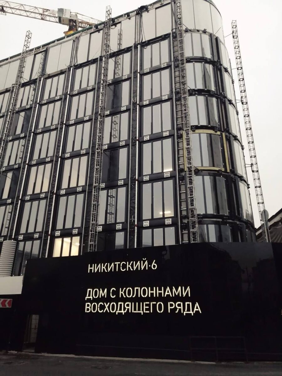 Часто сворачиваем на Новый Арбат с Никитского, видим эту стройку. Не понимаем, где должны быть колонны, наклеивать их будут