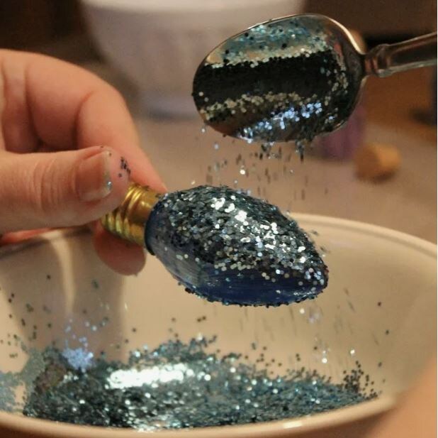 Наносите блёстки только на свежий, липкий клей. Если работаете медленно, делайте поверхность небольшими участками. Я использую клей-Скотч, даю выдержку 15 минут, чтобы стал прозрачным и наношу блестки. Выбирают слишком жидкий клей Знакомая другая крайность: блёстки тонут в клее и образуют кашу, а не мерцающий слой. Как правильно: