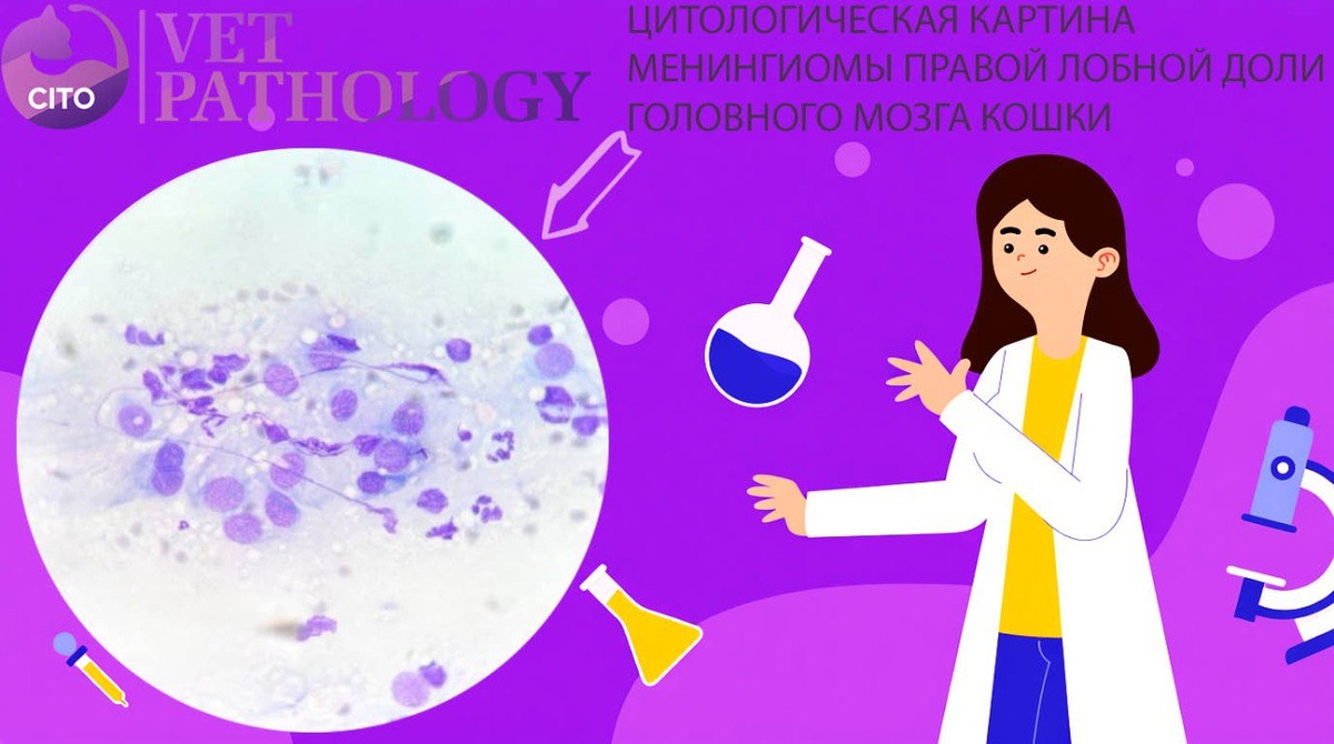 ✅ Цитологическая картина менингиомы правой лобной доли головного мозга. 🧪 Иногда врачам-цитологам приходится сталкиваться с необычными опухолями. Сегодня у нас именно такой случай, интересный прежде всего достаточно редкой для ветеринарной практики локализацией в головном мозге. Как правило, данные опухоли имеют множество симптомов. Важно, что в данном случае у нас есть и цитологическое, и гистологическое исследование. 🐱 В ветеринарную лабораторию «VetPathologyCito» поступил материал от пациента: самца кошки породы хайленд-фолд 13 лет. Владельцы отмечали у питомца неврологические дисфункции в виде эпилептических припадков и некоторые другие симптомы, характерные для многих патологий ЦНС 🧠 Первыми признаками развития менингиомы являются неврологические дисфункции, такие как судороги, тремор, манежные движения. Менингиома - широко распространённая опухоль у собак (до 45% случаев) и кошек (до 60% случаев). Предрасположены голден-ретриверы, колли и боксёры. 📊 Данному заболеванию