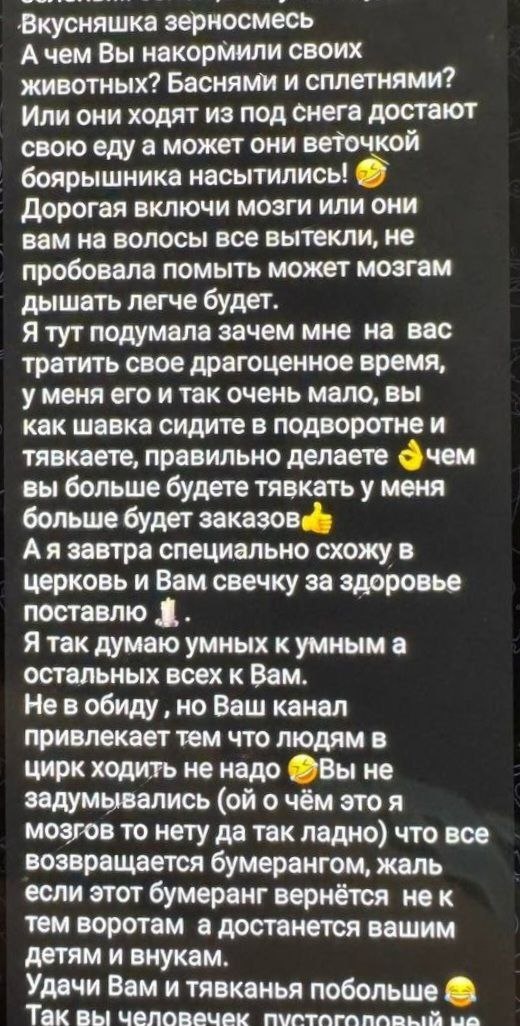 Я вот сижу и думаю, что мне с этим делать? Это в колхозной группе имени меня, где дают мне клички, как собаке, хозяйка упражняется в остроумии Весь этот пост обращён ко мне Особенно мне ,,нравится,, про церковь и свечки И еще про моих детей и внуков Я вот думаю, если мне заверить это ⬆️ и потом подать на сатисфакцию, она заткнётся? Или нет? А с виду тетя-божий одуванчик, пуховыми платками в интернете торгует