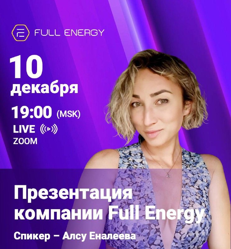 СРЕДА | 10.12 | 19:00 МСК | Zoom Презентация компании Full Energy Спикер - Алсу Еналеева Вы узнаете: • об уникальных продуктах, разработанных Full Energy • почему у этих продуктов нет аналогов • о бизнес-возможности на новом стремительно растущем рынке https://us06web.zoom.us/j/87078975418?pwd=qXrzcwmw8HKTTGQbbhwzl7rl5xIGgu.1 До встречи в эфире!