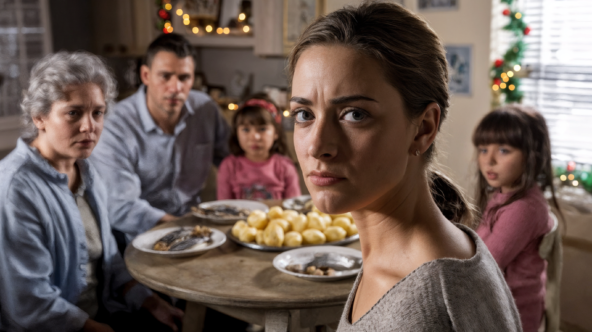 За столом повисла напряженная тишина. Дима накладывал себе картошку и делал вид, что всё в порядке. Лена ела селедку и изо всех сил сдерживала смех. Девочки молча жевали и переглядывались.
