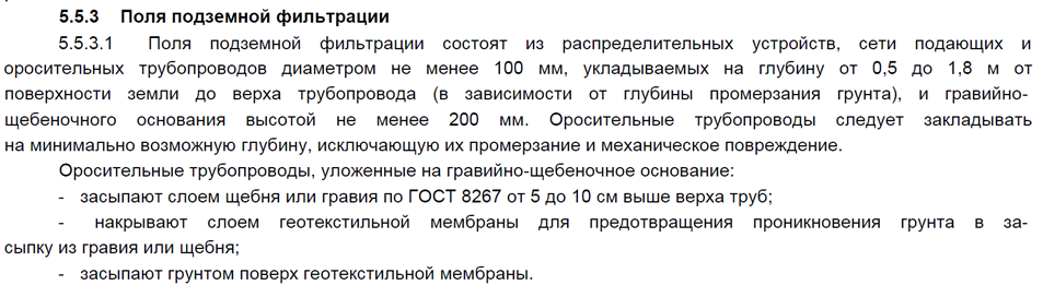 При сооружении поля подземной фильтрации септика необходимо решить какой слой щебня заложить под дренажной трубой, чтобы обеспечить нормальную работу поля фильтрации со сроком службы не менее 20-ти лет и, при этом, не перерасходовать деньги на лишний щебень. ГОСТ 70818-2023 рекомендует минимальную толщину слоя гравийно-щебеночного основания 200 мм (см. скриншот ниже). Стандарты некоторых стран предписывают чтобы слой щебня был не менее 300 мм. Уже в который раз автор замечает, что ГОСТ предполагает более оптимистичный сценарий развития событий, чем стандарты западных стран. 1. Поле фильтрации на щебеночном основании 300 мм