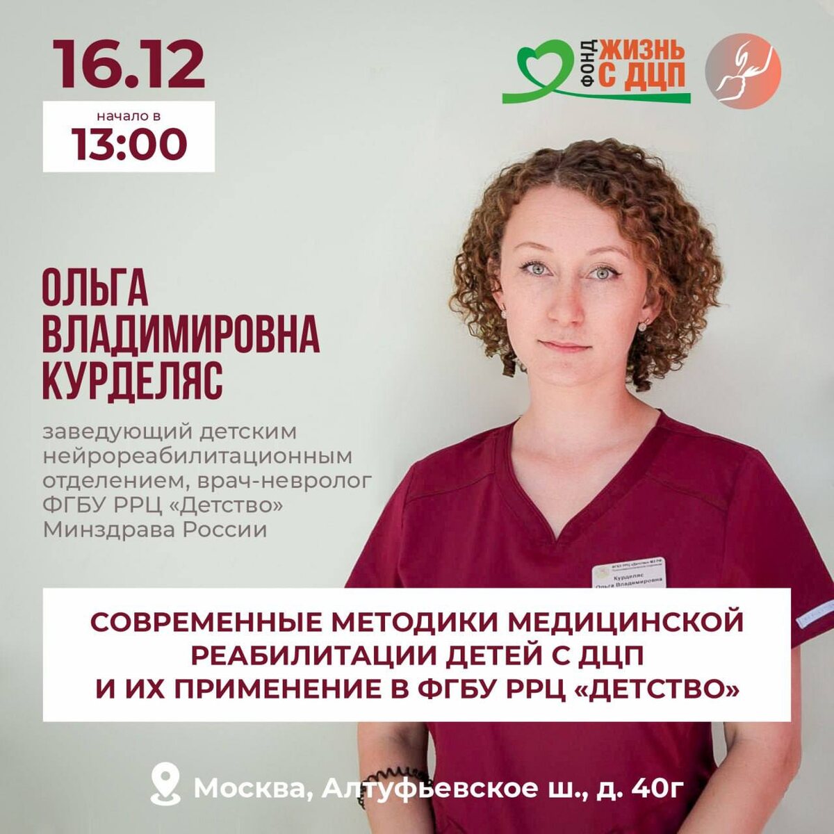 Дорогие родители, воспитывающие детей с диагнозом ДЦП! 🗓16 декабря 2025 г. в 13.00 в помещении фонда "Жизнь с ДЦП" по адресу Алтуфьевское шоссе 40Г, состоится встреча с зав. детским нейрореабилитационным отделением, врачом-неврологом ФГБУ РРЦ «Детство» Курделяс Ольгой Владимировной. 📄Доктор выступит с докладом «Современные методики медицинской реабилитации детей с ДЦП, и их применение в ФГБУ РРЦ «Детство»». На встрече вы узнаете: ✅Что такое диагноз ДЦП и как проявляется заболевание; ✅Какие существуют этапы оказания медицинской помощи детям с ДЦП (постановка диагноза, лечение и реабилитация); ✅Какие основные принципы оказания медицинской реабилитации; ✅ Как организована медицинская реабилитация в ФГБУ РРЦ «Детство» ; ✅ Какой порядок госпитализации и условия проживания в в ФГБУ РРЦ «Детство» . По окончании мероприятия гостей ожидают наши поздравления с Наступающим Новым Годом и очаровательные игрушки-лошадки, которые совершенно точно будут приносить радость и удачу в течение