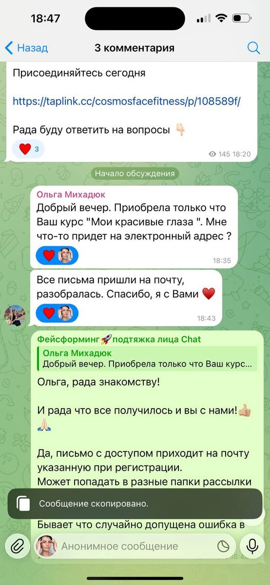 Ольга, рада знакомству! И рада что все получилось и вы с нами!👍🏼🙏🏻 Да, письмо с доступом приходит на почту указанную при регистрации. Может попадать в разные папки рассылки или спам, если не можете найти пишите мне @MariannaSpivak я проверю в системе. Бывает что случайно допущена ошибка в написании адреса почты и тогда письмо не уходит, после проверки я в ручную отправлю письмо с доступом,
