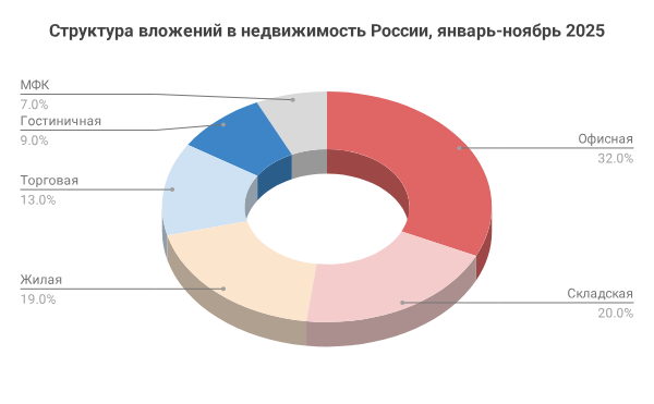 750 млрд рублей инвестиций – такой объем поступлений на рынок недвижимость России ожидают консультанты по итогам года Львиная доля «плана» уже выполнена: суммарно за неполные 11 месяцев инвесторы направили на покупку недвижимых объектов 712 млрд рублей. 💡 Жилье – далеко не в фокусе внимания тех, кто хочет извлечь максимальную прибыль. Половина денежных вливаний пришлась на офисы и склады. Лишь 20% – на жилые активы, причем год назад объем инвестиций в этот сегмент был на54% выше. Девелоперы не просто притормаживают запуск новых проектов, но и стремятся продать участки под застройку ЖК – сразу с документами. Также реализуют и проекты «на бумаге» – для тех, кто желает вложиться в строительство с нуля. 🏬 Самыми крупными сделками в жилом сегменте стала продажа земельных участков в бывших проектах Ingrad – «Белый Град» и «Новое Пушкино». В наступающем 2026 году эксперты прогнозируют снижение суммарного объема инвестиций в недвижимость до 600-650 млрд рублей.
