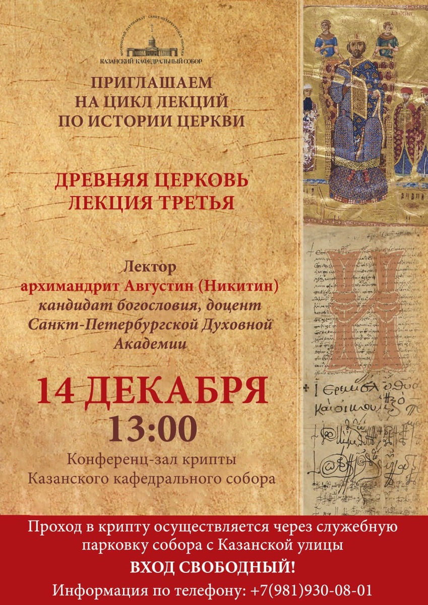 ПРИГЛАШАЕМ НА ЦИКЛ ЛЕКЦИЙ ПО ИСТОРИИ ЦЕРКВИ Приглашаем всех желающих на лекцию "Древняя Церковь. Лекция третья" кандидата богословия, доцента Санкт-Петербургской Духовной Академии архимандрита Августина (Никитина) в конференц-зале крипты Казанского кафедрального собора 14 декабря в 13 часов. ✅ Вход свободный. ⠀ Проход в крипту осуществляется через служебную парковку собора со стороны Казанской улицы или через кафе "Крипта" со стороны набережной канала Грибоедова. ⠀ ☎️Справки по телефону: +7(981)930-08-01
