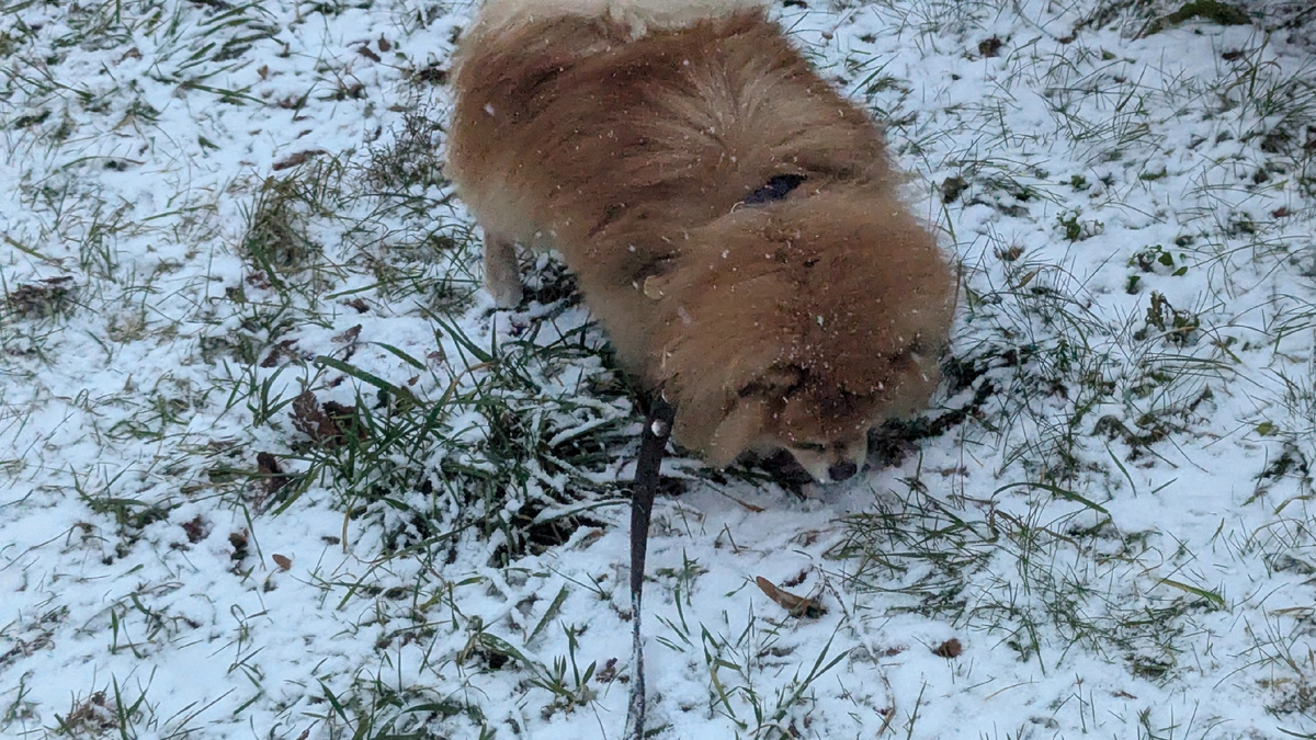 Симба, наш четвероногий восторг, носился, оставляя на нежной пороше цепочки следов, с удивлением нюхал и пробовал на вкус это холодное диво.