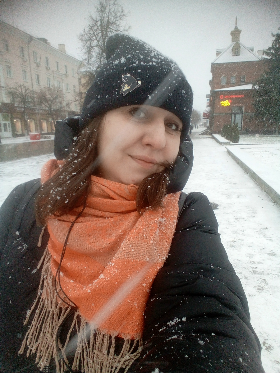 Эта неделя ознаменовалась снегом!!!! Наконец-то)))) Так радостно было в первый снежный день! Оказалась в этот день в центре города, шла по улице и смотрела, как серый город превращается в белый. В наушниках играла песня "Мечты" Александра Иванова: "Город в дымах, эта зима нас до весны сводит с ума...." Такая милая снежная морда у абашевской игрушки))) И у кого-то опять кофе)) Шла из поликлиники, ничего такого ужасного там не делала, но антистресс - это уже традиция. Обычно под антистрессовые мероприятия попадают "Додо-пицца", "Леонардо" и секонд. Или хотя бы пончики из "Магнита" )) Деревья ещё будто нарисованы чёрными прожилками на бесцветном небе. Но уже вечером всё побелело. Добыча в секонде - сумка за 150 рублей. Не знаю, зачем, но надо))) Она не тряпочка, это кожзам с рисунком. Окажись она моей в 19 лет - пищала бы от восторга))) Сейчас не смогла не взять, как раз поношу с чёрным пуховиком, без объёмных вещей мне не очень понравилось, как смотрится. А так очень моя вещь, особен