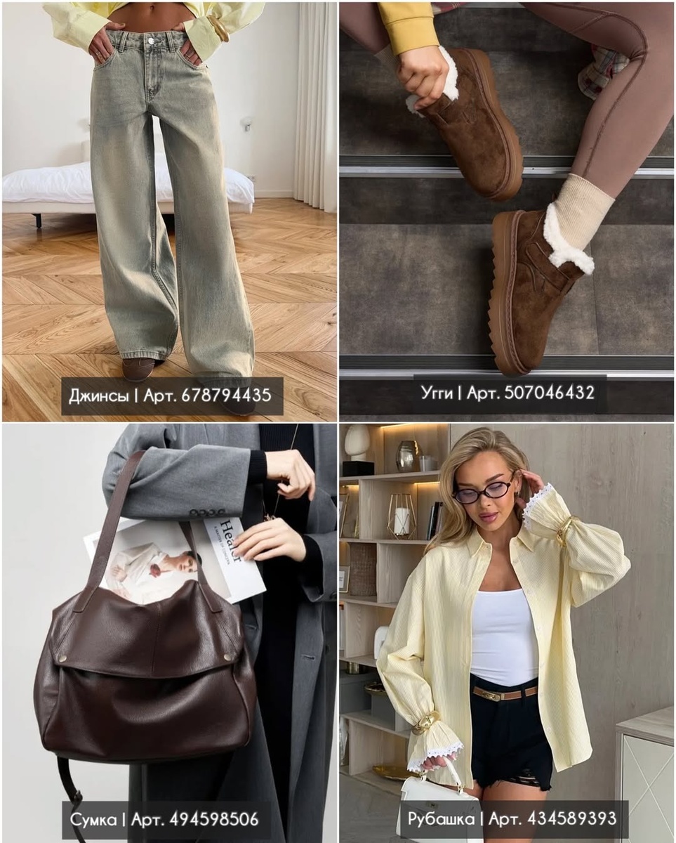 Современные образы — это сочетание комфорта, легкости и тщательно подобранных деталей. Сегодня мода не требует сложных формул, она стремится к естественности, подчеркивает индивидуальность и помогает выглядеть стильно в любой день. В этой подборке мы разберём каждый элемент, каждую вещь с WВ, показанную на фото: расскажем о её особенностях, крое, фактуре, визуальном эффекте. Статья поможет вам увидеть, как вещи создают настроение и работают в образе, а советы стилиста сделают ваши комплекты гармоничнее и выразительнее. ОБРАЗ 1. Небрежная легкость с акцентом на линии силуэта Джинсы — арт. 678794435 Широкие джинсы — один из самых актуальных трендов последних сезонов. Подробное описание: Мягкая прямая линия брюк создаёт эффект вытянутого силуэта. Светло-песочный оттенок денима с лёгким пылевым градиентом выглядит дорого и универсально. Высокая посадка подчёркивает талию и визуально формирует стройный силуэт. Ширина брючин позволяет создавать расслабленные, воздушные образы. Совет стилис