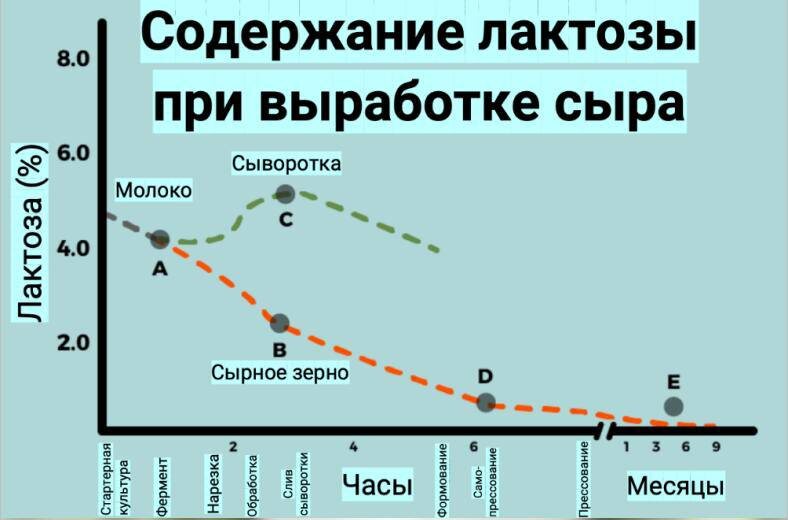 Что же не есть молочные продукты совсем людям с лактазной недостаточностью? Конечно же выход есть, и даже несколько! 1. Употреблять безлактозные молочные продукты. Для того, чтобы сделать безлактозное молоко, йогурт, творог, в молоко сначала добавляют фермент галактазу, он расщепляет лактозу на простейшие сахара. Потом из такого молока можно делать другие молочные продукты. 2. Можно принимать пищевые добавки БАДы, которые содержат фермент галактазу. Так мы привносим извне то, что не вырабатывает организм. 3. Есть выдержанный сыр безбоязненно – посмотрите на рисунок – в сыре не остается лактозы. Она или уходит с сывороткой (большая часть), остатки перерабатываются бактериями закваски.