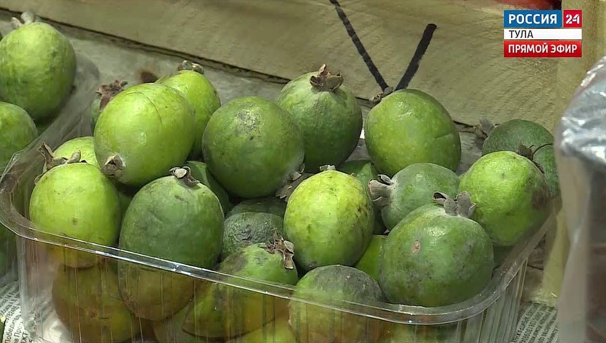 Ананас, земляника и гуава – все в одной ягоде. Фейхоа фрукт особенный, сказать сразу, на что похож трудно, вкус многогранный. Его можно есть свежим, добавлять в салаты, готовить джемы и варенья. Полезная экзотика на тульских рынках не редкость. Как рассказала Ольга Рожкова, администратор рынка, «произрастает фейхоа на юге России, в Крыму, также в Абхазии, Армении, Грузии, Туркменистане. Это ценнейшая ягода. В народе ее называют витаминной бомбой по своим ценным свойствам». Фейхоа – это не только вкусный, но и полезный фрукт. Он богат витамином С, который укрепляет иммунную систему. Также в фейхоа содержатся антиоксиданты, они замедляют старение клеток. Ягода полезна для пищеварения благодаря высокому содержанию клетчатки и улучшает работу кишечника. Ирина Матюхина, ведущий специалист-эксперт отдела надзора за питанием населения Управления Роспотребнадзора по Тульской области: «Ягода очень полезная, она содержит большое количество йода, который благотворно влияет на работу нашей щитовид