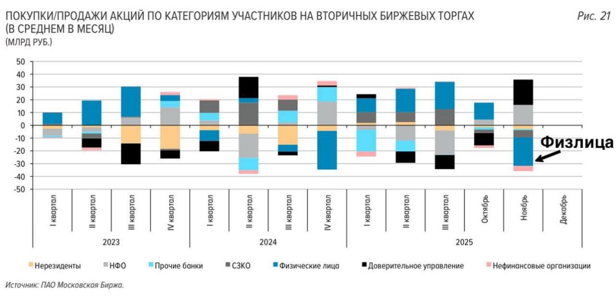 Кто в ноябре покупал и кто продавал акции В ноябре физики впервые стали продавать акции Как раз, когда, думаю что выгодно покупать ! Сегодня на сайте ЦБ РФ вышел обзор рисков финансовых рынков cbr.ru/Collection/Collection/File/59479/ORFR_2025-11.pdf Физические лица (Розничные инвесторы), с января активно покупавшие акции, перешли к нетто-продажам, продали в ноябре на 22,3 млрд руб.). Крупнейшими нетто‑покупателями стали НФО (нефинансовые финансовые организации) за счет собственных средств и в рамках доверительного управления, приобрели акций на собственные средства 16,0 млрд и в доверительном управлении на 19,8 млрд руб. В II и III кварталах они преимущественно продавали ценные бумаги. ВЫВОД В ноябре мелкие участники рынка впервые в 2025г продавали Покупали у них крупные участники рынка