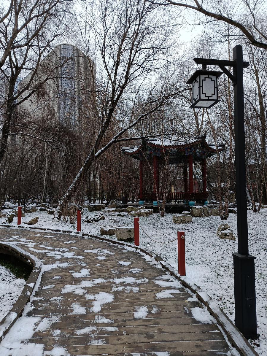 Парк Хуамин в Москве - один из тех редких уголков, где сейчас, в преддверии Нового года, можно спокойно погулять без толп. Зимой здесь особенно тихо: почти нет людей, и звук шагов по снегу кажется единственным шумом. Это делает парк отличным местом для интровертов или просто тех, кто хочет побыть наедине с собой. Этот китайский сад, словно вырванный из страниц древних свитков, предлагает не просто прогулку, а погружение в атмосферу гармонии, умиротворения и философского размышления. В зимний вечер, когда снег покрывает землю белым одеялом, а городская суета отступает на второй план, парк становится настоящим раем для тех, кто ценит тишину и уединение. Если вы - человек, которому нужно пространство для дыхания, мыслей и внутреннего диалога, то парк Хуамин создан именно для вас. В отличие от многолюдных центральных парков, здесь почти нет народа. Вы можете медленно прогуливаться по извилистым тропинкам, слушать шелест снега под ногами и любоваться отражением красных колонн в застывшей