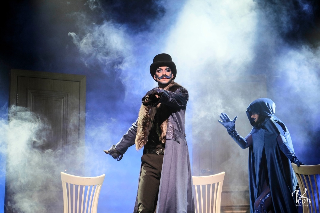 Но в этом хороводе обмана и теней, Синяя борода (Дмитрий Сошин) даже не легендарный злодей в сказке, способной пугать непослушных маленьких детей, а, скорее, всемогущий конферансье дьявольского варьете, гамельнский крысолов, «дудочкой» которого стала необыкновенная притягательность греха, соблазнительное обаяние, которому нет сил противиться.