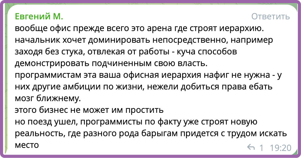 Я собственник нескольких бизнесов. 8-9 часов на работе. И у меня нет ни малейшего желание доминировать, как пишут на картинке из чата. Я хочу богатеть с командой. Если команда делает бизнес, мы заработали 1 млн. рублей, то богатеют все и я и команда. А те кто пишут такое просто никогда не делали бизнес сами, не строили команду, не рисковали деньгами, не испытывали кассовые разрывы и т.п. Пишу эти строки с работы... А не с сказочного острова Тенерифе. Русский ИТ бизнес
