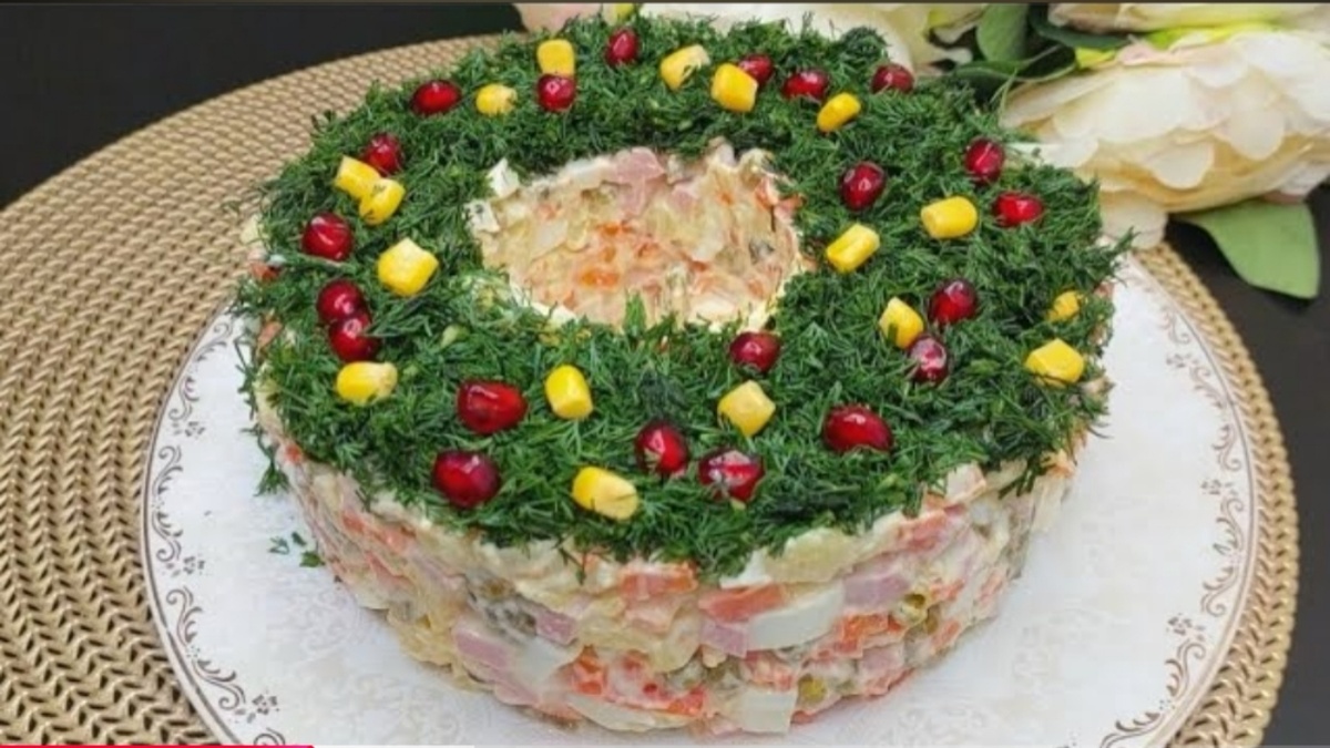 Вот классический и очень вкусный рецепт салата Оливье, как на фото — можно оформить его в виде праздничного кольца, украсив зеленью, кукурузой и гранатом. # 🥗 Салат Оливье — классический рецепт ## ✅ Ингредиенты: ### Основные: * Картофель — 3 шт * Морковь — 2 шт * Яйца — 4 шт * Колбаса варёная (или курица/ветчина) — 300 г * Огурцы солёные — 3 шт * Зелёный горошек — 1 банка * Майонез — 4–6 ст. л. * Соль — по вкусу * Чёрный перец — по вкусу ### Для украшения (как на фото): * Укроп — большой пучок * Кукуруза консервированная * Зёрна граната # 🍽 Приготовление ## 1. Подготовка ингредиентов 1. Картофель и морковь сварите в мундире, остудите и очистите. 2. Яйца сварите вкрутую. 3. Всё (картофель, морковь, яйца, огурцы, колбасу) нарежьте кубиками. ## 2. Смешивание 1. В большой миске соедините все нарезанные ингредиенты. 2. Добавьте зелёный горошек. 3. Заправьте майонезом. 4. Посолите и поперчите по вкусу. 5. Аккуратно перемешайте. ## 3. Праздничное оформление (как на