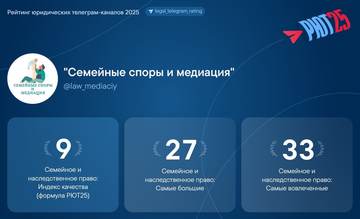 Рейтинг юридических каналов РЮТ-2025 Сегодня опубликовали рейтинг юридических телеграм каналов РЮТ-2025! 🤩 В 2023 году в этом рейтинге мой канал занял 5 место в категории "Семейное и наследственное право". 🤩 В 2024 году в этом рейтинге мой канал занял в категории "Семейное и наследственное право" 17 место среди самых больших и 29 место среди самых вовлеченных В рейтинге в 2025 году участвовали более 2900 каналов! Количество каналов растёт ☺️ Поэтому 9️⃣ место в номинации "Семейное и наследственное право" Индекс качества (формула РЮТ25) это отлично ☺️ Благодарю, всех подписчиков за то что вы со мной❤️ 🤩 "Семейные споры и медиация" @law_mediator #осебе